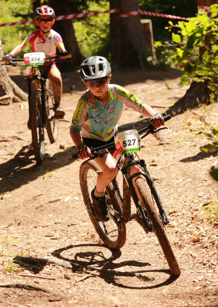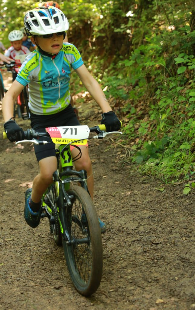 La course est rapide, mais semée d’embûche, certains passages sont techniques et glissants. Une des montées les oblige à poser le pieds à terre et pousser le vélo. Alexis nous fait une belle démonstration du saut sur le vélo, qui réjouira Etienne ! Léo termine 11ème, Loïs 14ème, Jean 17ème, Adrien 18ème, Alexis 20ème, Lewis 34ème, Samuel 37ème. Sasha termine 2ème poussine